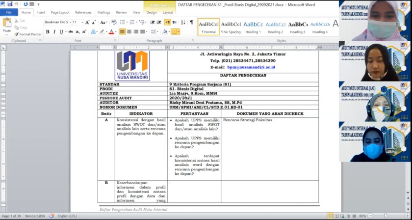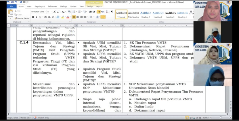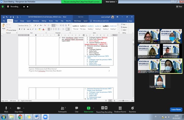 Audit Mutu Internal Tahun Akademik 2020/2021  yang dilaksanakan pada tanggal 21 – 22 Juli 2021 untuk Program Studi  Sains data, Bisnis Digital, Manajemen dan perhotalan. Selain itu terlaksanan juga pada tanggal  28 – 29 Juli 2021 untuk program Studi Ilmu Komputer, Sistem Informasi dan Teknik Informatika. Proses Audit Mutu Internal dihadiri oleh Rektor Universitas nusa Mandiri, Seluruh Ketua Program Studi sebagai Auditee dan para auditor. Audit Mutu Internal ini dilaksanakan secara daring dengan menggunakan Zoom Meeting.