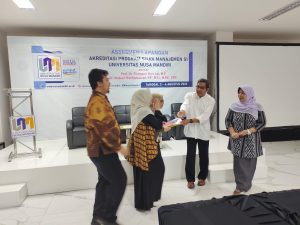 Dalam hal ini Program Studi (Prodi) Manajemen yang baru sekitar 2-3 tahun berdiri tepatnya tanggal 5 April 2021 telah menyelesaikan akreditasi pertamanya pada Kamis s.d Jumat tanggal 03-04 Agustus 2023 bertempat di Aula Universitas Nusa Mandiri Kampus Margonda. Prodi Manajemen Fakultas Ekonomi dan Bisnis Universitas Nusa Mandiri (UNM) diakreditasi oleh LAM MEMBA (Lembaga Akreditasi Mandiri Ekonomi, Manajemen, Bisnis, Dan Akuntansi) dengan 2 orang asesor yaitu yang bernama Bapak Prof. Dr. Pramono Hari Adi, M.S, dan Dr.Andewi Rokhmawati, SE, M.Si, M.Ed, CRP, M.Kom,. Kegiatan Akreditasi Lapangan (AL) ini disambut dengan sangat baik oleh seluruh sivitas akademika di UNM, salah satu bukti yaitu Rektor UNM Prof. Dr. Ir. Dwiza Riana, S.Si, MM, M.Kom, IPU, ASEAN.Eng beserta jajaran turut mendampingi selama AL berlangsung. Seluruh tim pada Unit Kerja sangat sigap dalam menyajikan pemberkasan beserta data yang diminta oleh asesor.