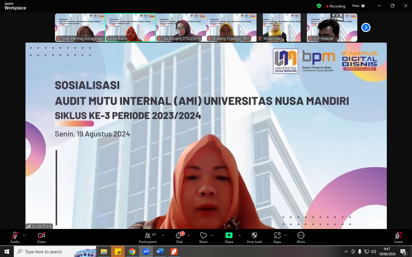 Pada Hari Jumat tanggal 19 Agustus pukul 09.00 WIB Badan Penjamin Mutu (BPM) mengadakan “Sosialisasi Audit Mutu Internal (AMI) Siklus Ke-3 Universitas Nusa Mandiri Periode 2023/2024” melalui Zoom meeting. Kegiatan ini dihadiri oleh Rektor UNM, Warek I Bidang Akademik, Warek II Bidang Non Akademik, Kepala Biro, Kepala Lembaga, Dekan, Ketua Program Studi, Kepala bagian beserta para Auditor UNM. Tujuan pelaksanaan AMI bagi perguruan tinggi berdasarkan Alasan Yuridis yaitu amanat undang-undang serta bagian dari kriteria akreditasi. Untuk memastikan pelaksanaan kegiatan di Perguruan tinggi sesuai dengan prosedur dan hasilnya telah sesuai dengan standar yang telah ditetapkan untuk mencapai target institusi.