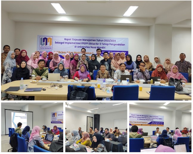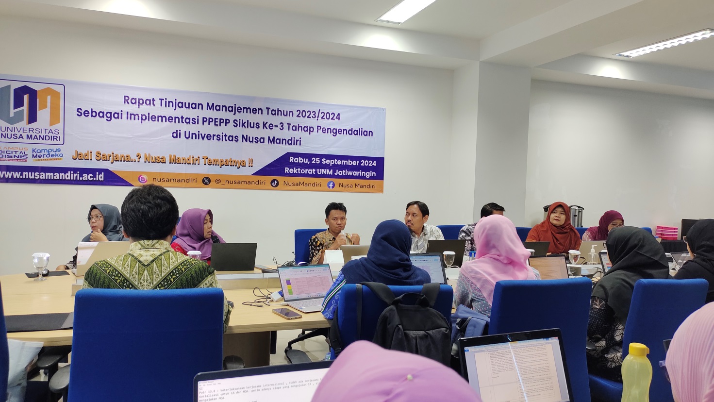 Rapat Tinjauan Manajemen (RTM) merupakan salah satu kegiatan wajib yang diselenggarakan oleh Universitas Nusa Mandiri setiap selesai pelaksanaan Audit Mutu Internal (AMI). RTM bertujuan untuk meninjau hasil implementasi Sistem Penjaminan Mutu Internal (SPMI) Tahun Akademik 2022/2023. Kegiatan ini merupakan bagian dari implementasi siklus PPEPP pada tahap pengendalian, sekaligus sebagai Rencana Tindak Lanjut (RTL) untuk mencapai optimalisasi. RTM Tahun Akademik 2023/2024 diselenggarakan pada tanggal 25 September 2024, pukul 09.00-16.30 WIB, bertempat di Ruang RapatĀ Nusa Mandiri Tower Jatiwaringin.