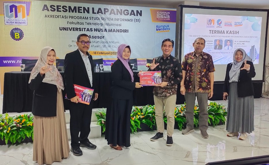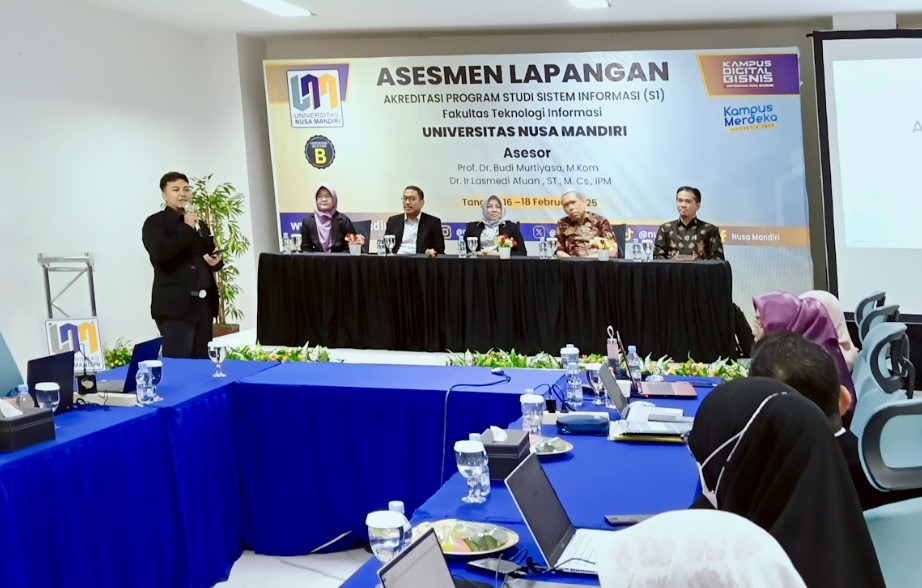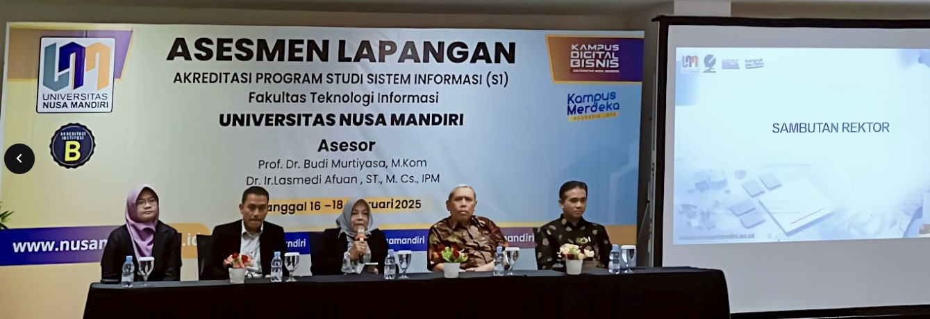 Universitas Nusa Mandiri (UNM) kembali menunjukkan komitmennya dalam meningkatkan kualitas pendidikan dengan melaksanakan proses akreditasi untuk Program Studi Sistem Informasi. Kegiatan ini berlangsung pada 16-18 Februari 2025 dan dihadiri oleh asesor dari Lembaga Akreditasi Mandiri Informatika dan Komputer (LAM Infokom) yaitu Prof. Dr. Budi Murtiyasa, M.Kom dan Dr. Ir. Lasmedi Afuan, ST, M.Cs, IPM.