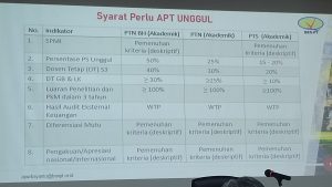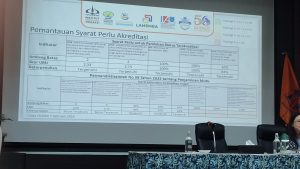 Lebih lanjut, dijelaskan berbagai persyaratan penting dalam pengajuan akreditasi unggul, seperti ketersediaan dosen tetap, persentase dosen berkualifikasi doktor, luaran penelitian dan pengabdian kepada masyarakat, serta hasil audit eksternal yang baik. Seluruh proses akreditasi juga menekankan pada validitas data berbasis bukti yang terintegrasi dengan sistem seperti SISTER dan SINTA.